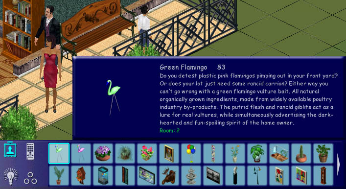 - Place a green flamingo nearby your Sims, and see how your family reacts!